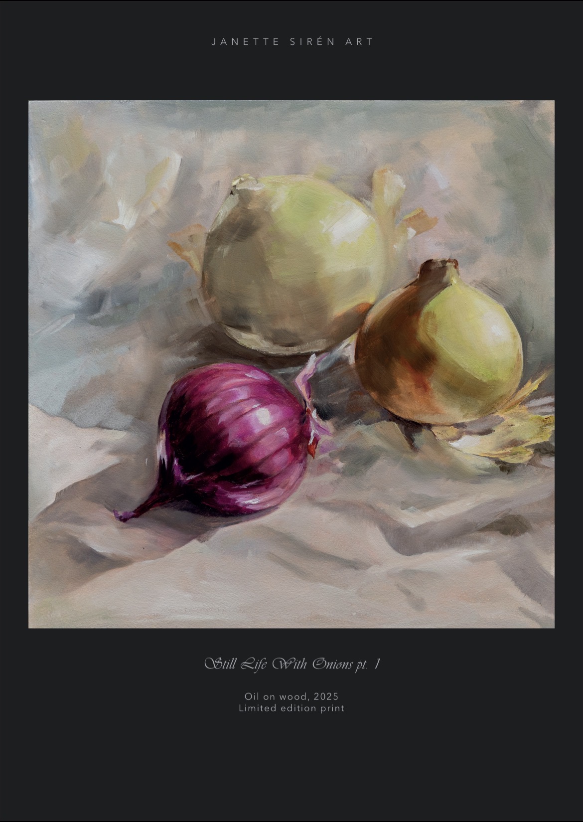 Still Life With Onions pt. 1 on Janette Sirénin alkuperäisteokseen perustuva taidejuliste. Alkuperäinen maalaus on toteutettu öljyväreillä puulevylle vuonna 2025.